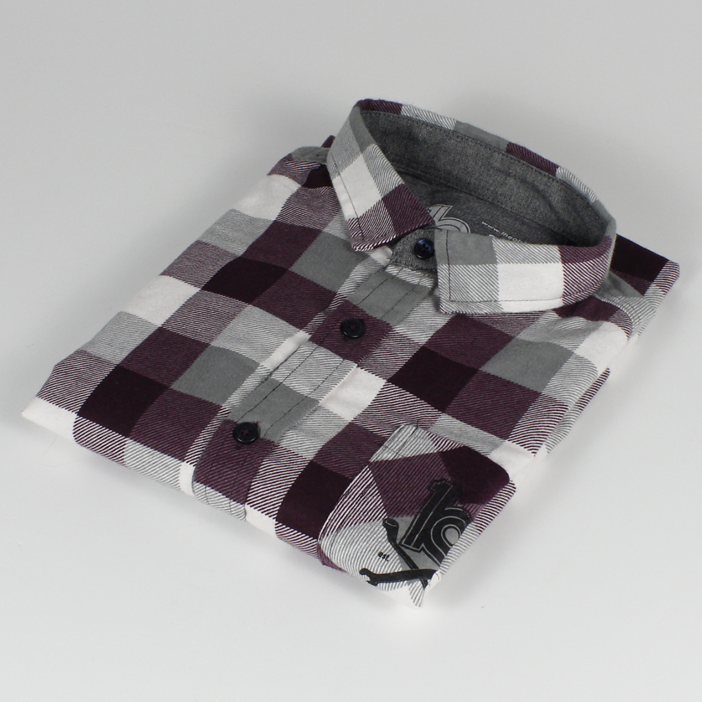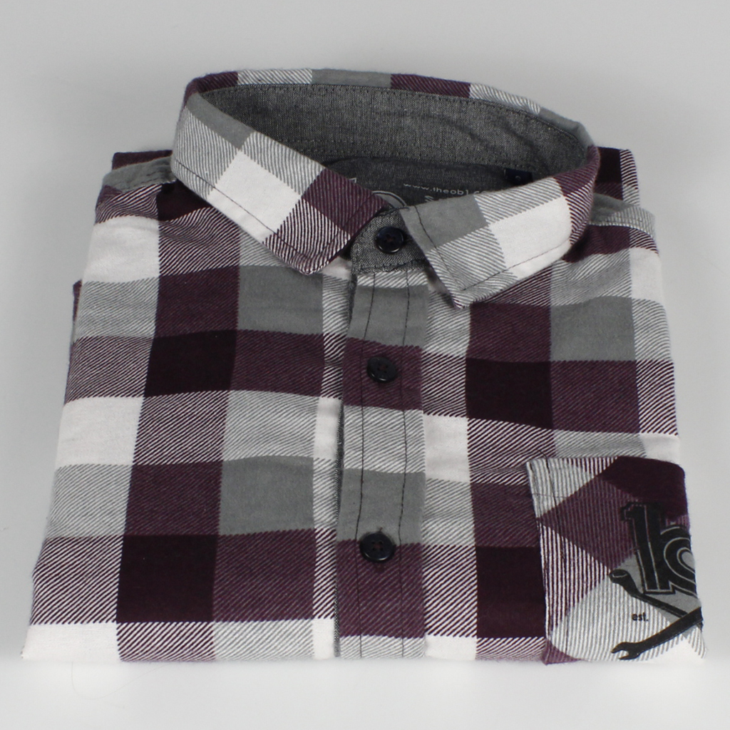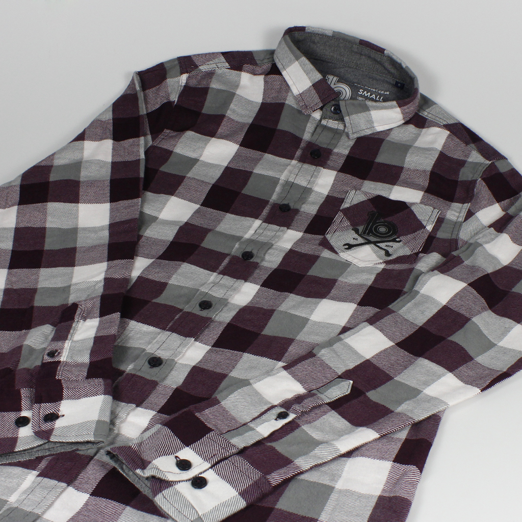Checked Shirt Burgundy/Grey/White • 100% cotton button down shirt • Hand screen printed • ob1 cross spanners logo small front pocket print • ob1 logo small rear print • Burgundy/Grey/White £30 Like Loading...